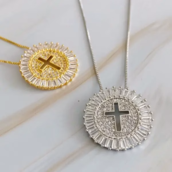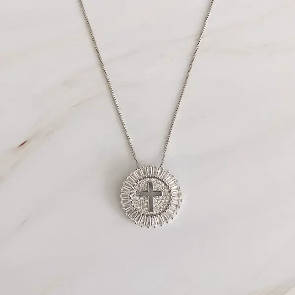 Gorgeous necklace with cut out cross in sparkly round charm.