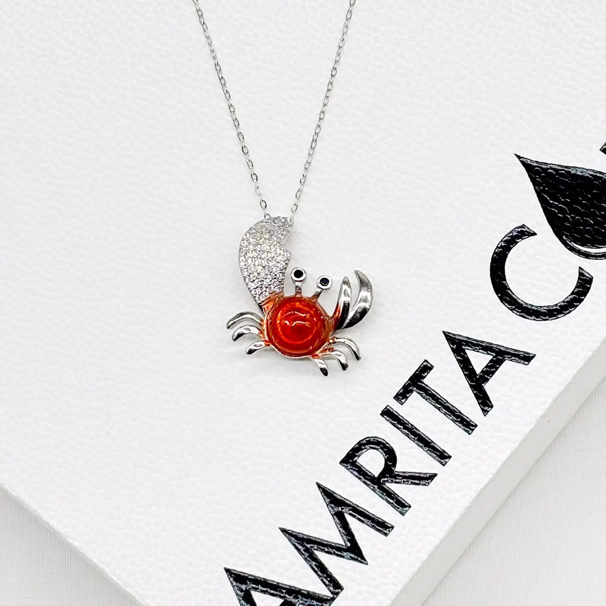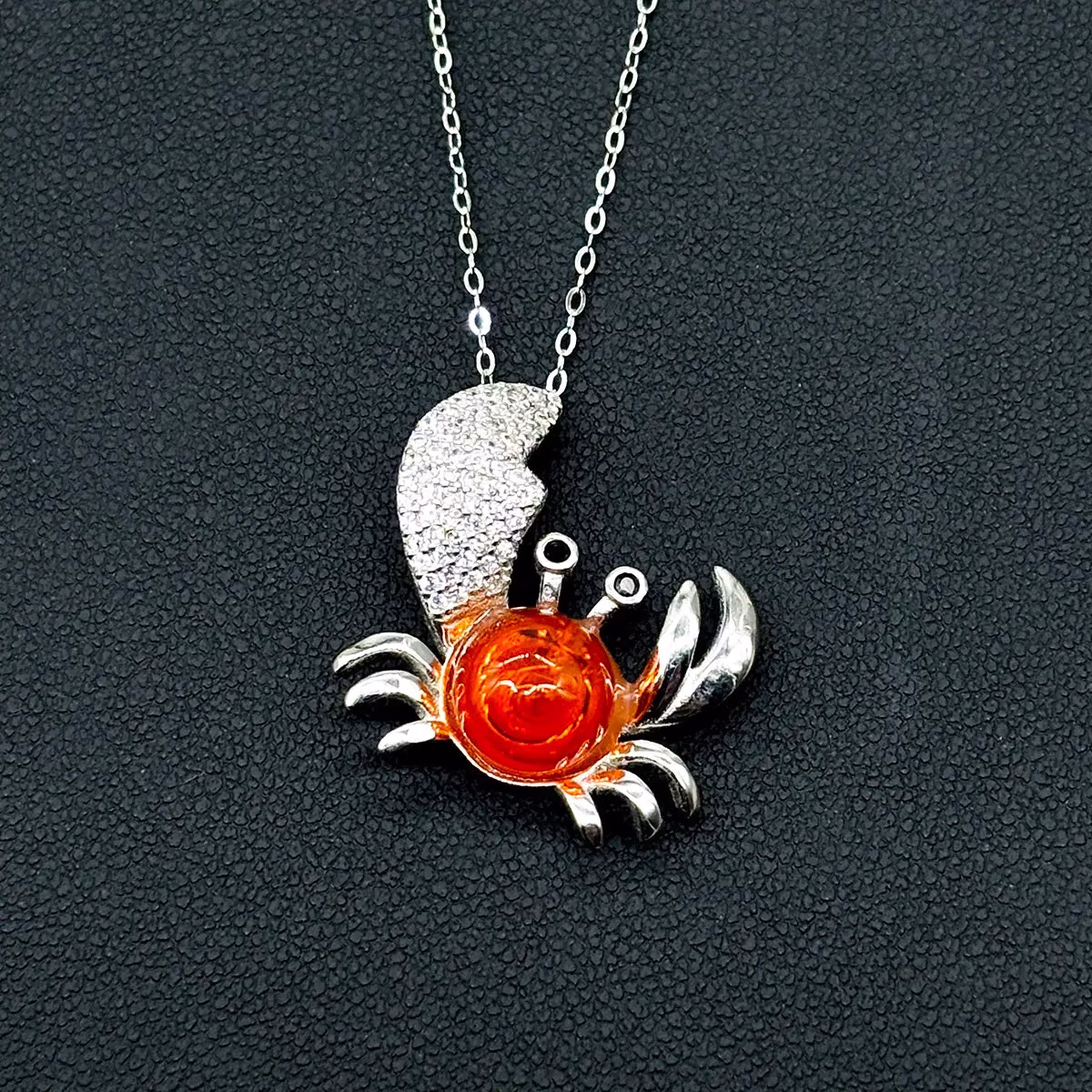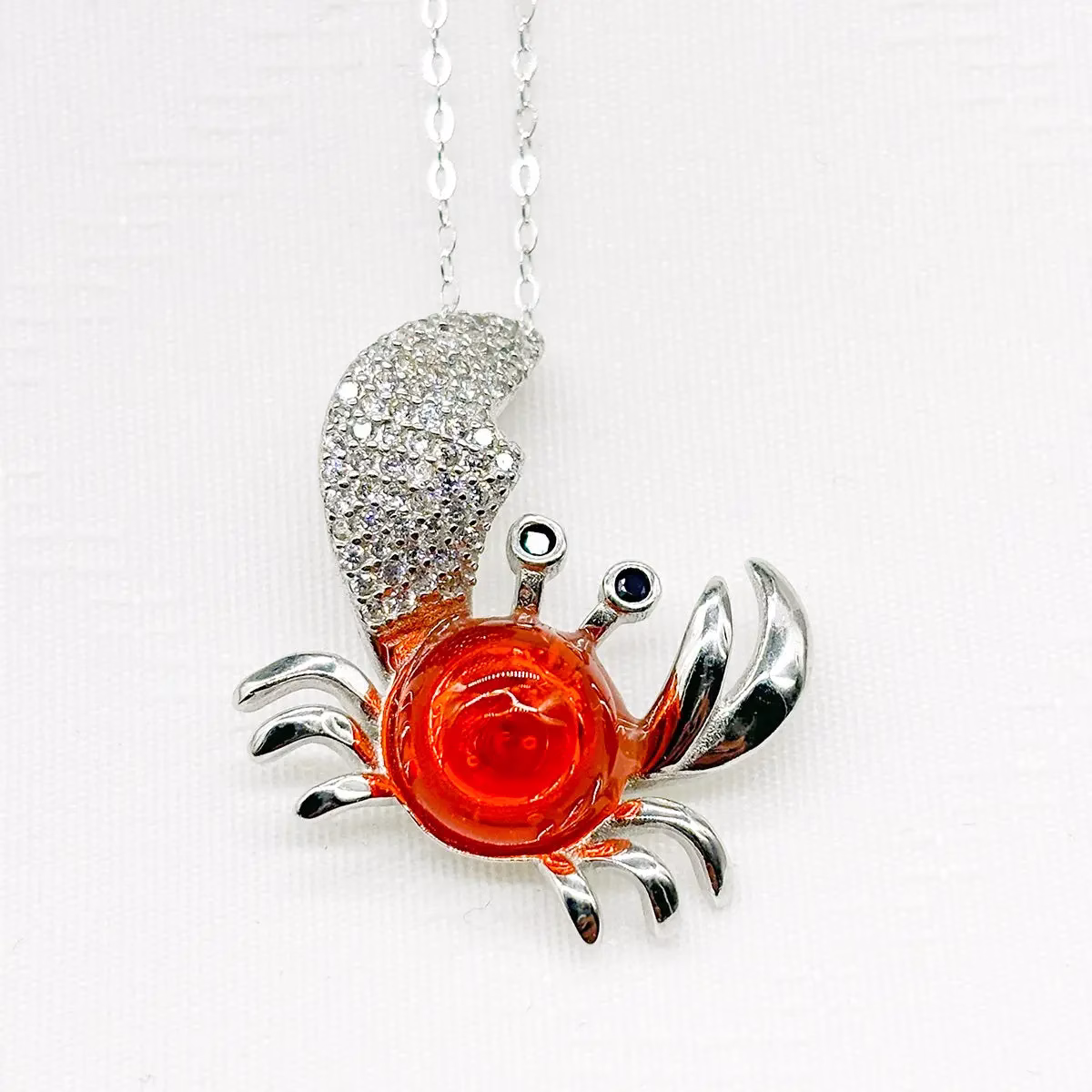 Elevate your style with our stunning new King Crab Aroma Necklace with Fire Orange ball, a harmonious blend of exquisite design and timeless aroma. Crafted with care, the pendant and chain gleam are purely Sterling silver (925 silver) adorned with beautiful white cubic zirconia stones, while the Murano glass pieces are meticulously hand-blown.