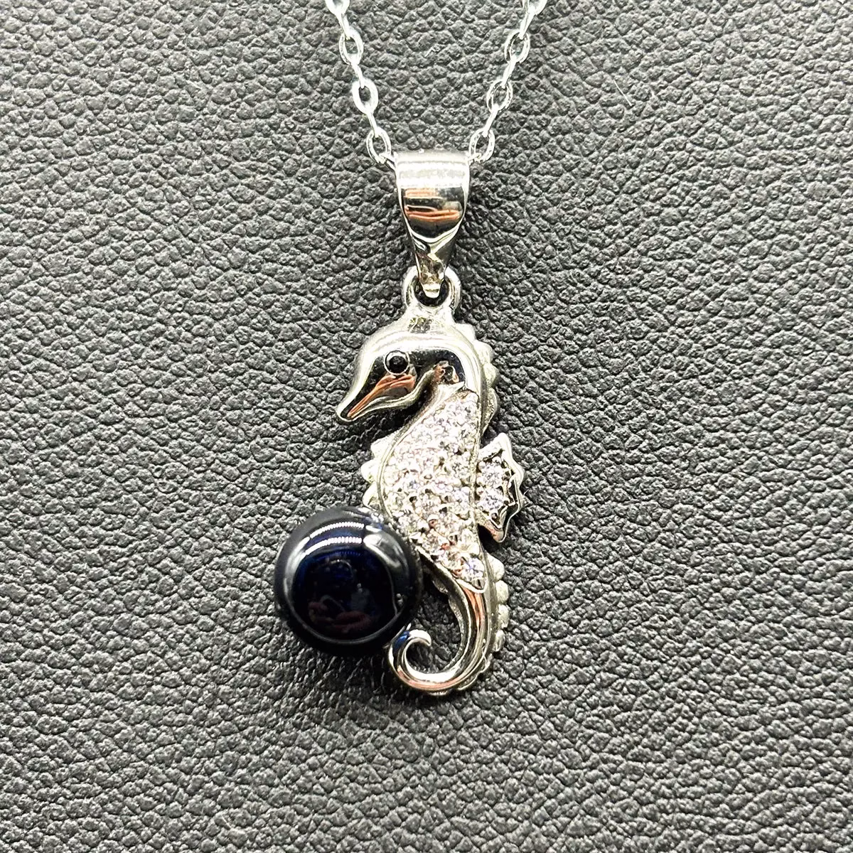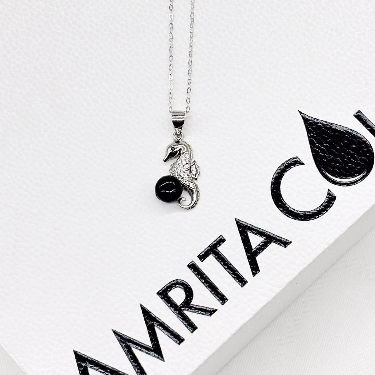 Elevate your style with our stunning new Sea Horse Aroma Necklace with black ball, a harmonious blend of exquisite design and timeless aroma. Crafted with care, the pendant and chain gleam are purely Sterling silver (925 silver) adorned with beautiful white cubic zirconia stones, while the Murano glass pieces are meticulously hand-blown.